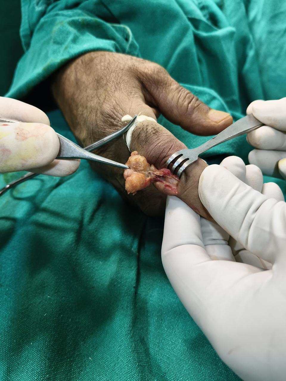 The image below shows the benign tumor being carefully excised from the right index finger. The growth is being separated from the surrounding tissue with minimal disruption to the finger’s normal structures.