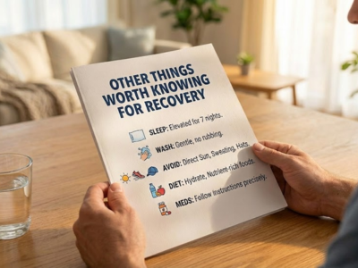- Sleep matters more than people realise. Keep your head slightly elevated for at least the first four or five nights — an extra pillow, or sleeping in a recliner if you have one. It reduces the morning swelling significantly.