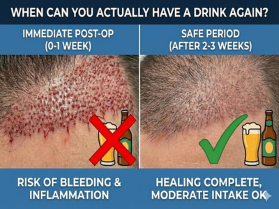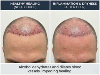 Some surgeons say a full month, especially if you had a larger session — say 2,500 grafts and above — or if you had noticeable swelling post-op. But the baseline recommendation across the board is two weeks of zero alcohol, and then a slow, cautious return to drinking after that.