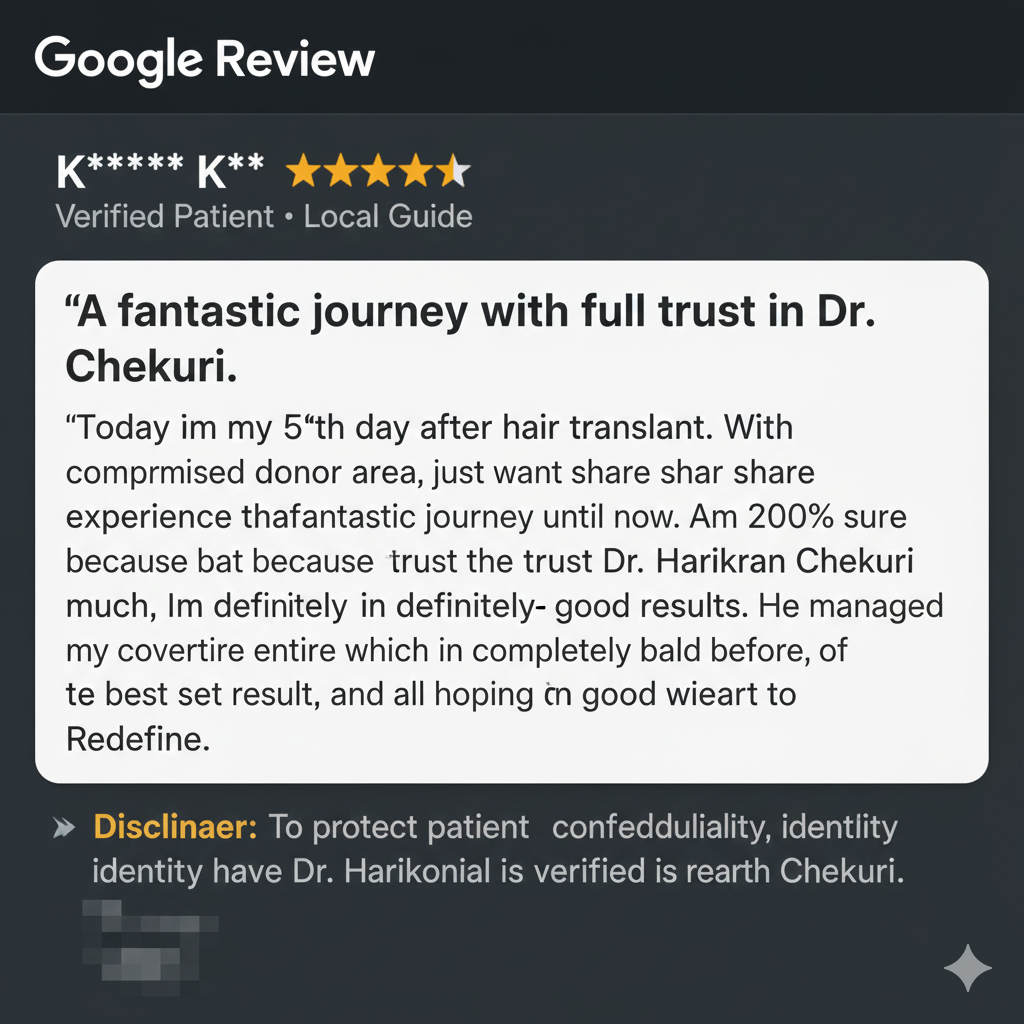 I am 200% sure that because I trust Dr. Harikiran Chekuri so much, I am definitely going to get good results. He managed to cover my entire area which was completely bald before. I am hoping for the best result, and all my good wishes from my heart to Redefine.”