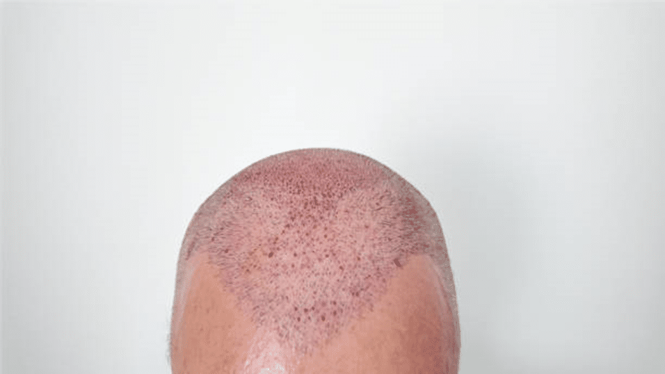 Healing progress: Tiny dots where grafts were implanted begin blending into the surrounding scalp.